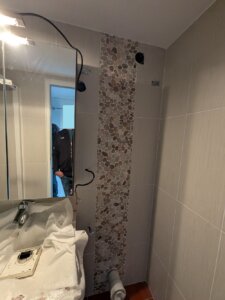 La faïence a donc été reprise dans son intégralité pour garantir une unité parfaite. La salle de bain a été restituée à l’identique — même carrelage, même esprit, comme si rien ne s’était passé.