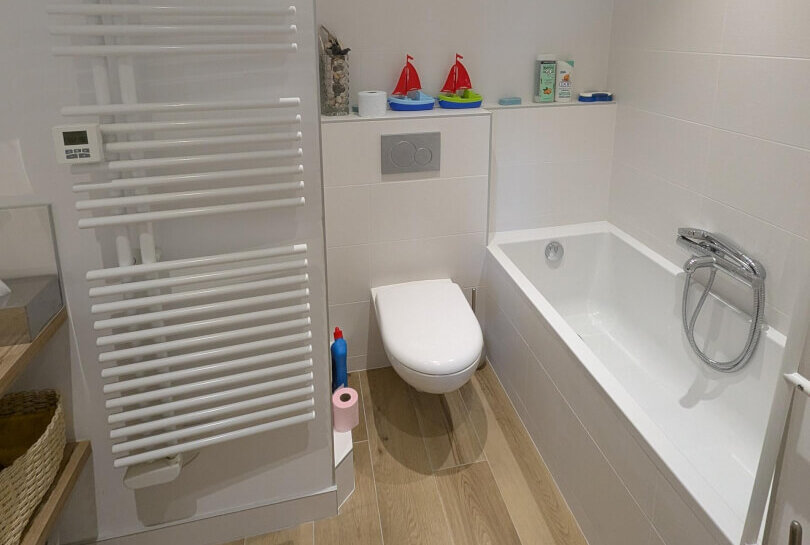 Dans ce second logement, la colonne se trouvait derrière le bâti-support du WC suspendu. Sans possibilité d’accès sans démolition, nous avons procédé à la dépose complète du bâti, cassé pour atteindre la gaine, remplacé la colonne, puis reposé l’ensemble. La contrainte ici était d’ordre esthétique autant que technique : la salle de bain avait été entièrement refaite récemment par le propriétaire.